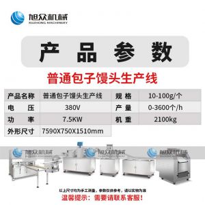 名稱智能包子饅頭生產(chǎn)線 電源380V 功率7.5KW 產(chǎn)量0-3600個/h 尺寸7590X2750X1510m 重量2100kg 規(guī)格10-100g/個 其他