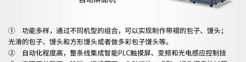 智能包子饅頭生產(chǎn)線,功能多樣,通過不同機型的組合,可以實現(xiàn)制作帶褶的包子、饅頭;光滑的包子、饅頭和方形饅頭或者做多彩包子饅頭等