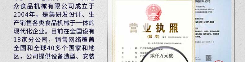廣州旭眾食品機械有限公司是一家集科研開發(fā),生產(chǎn)設計,營銷服務為一體的現(xiàn)代化生產(chǎn)企業(yè)?,F(xiàn)代化生產(chǎn)車間,精湛制造技術,所產(chǎn)機械歷經(jīng)市場重重考驗,不斷贏得海內外客戶的贊譽。