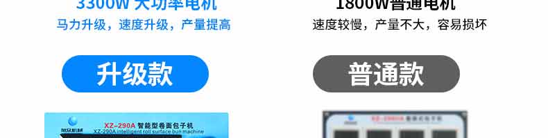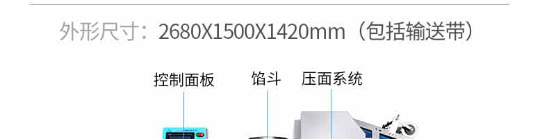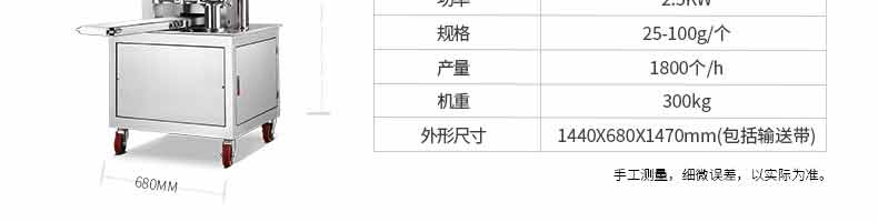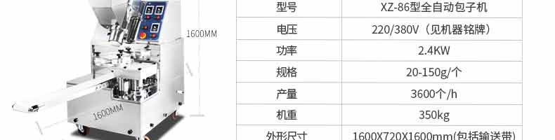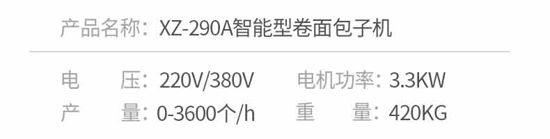 名稱XZ-290A智能型卷面包子機 電源 功率3.3KW 產(chǎn)量0-3600個/h 尺寸2680*1500*1420mm(包括輸送帶) 重量420KG 規(guī)格 其他