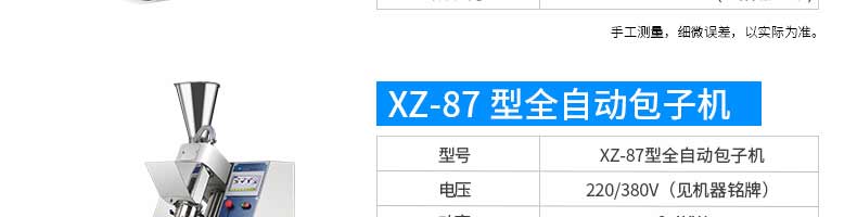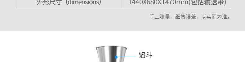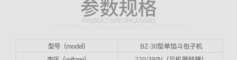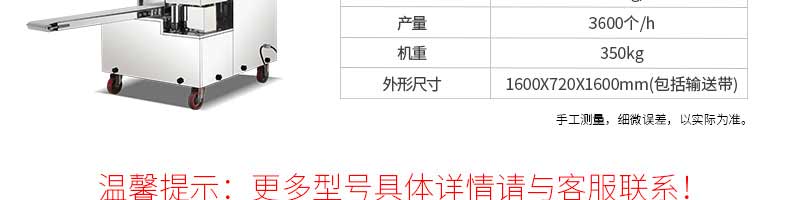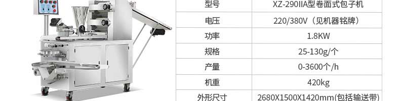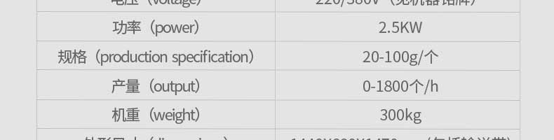 名稱旭眾30單餡斗包子機 電源220/380V(見機器名牌) 功率2.5kw 產(chǎn)量0-1800個/小時 尺寸1440*680*1420mm(包括輸送帶) 重量300KG 規(guī)格20-100克/個 其他
