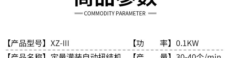 名稱XZ-III定量灌裝自動(dòng)扭結(jié)機(jī) 電源220V 功率0.1KW 產(chǎn)量30-40個(gè)/min 尺寸700×800×1600mm 重量165kg 規(guī)格50g-1000g 其他【料斗容量】23/63升(標(biāo)配23L)