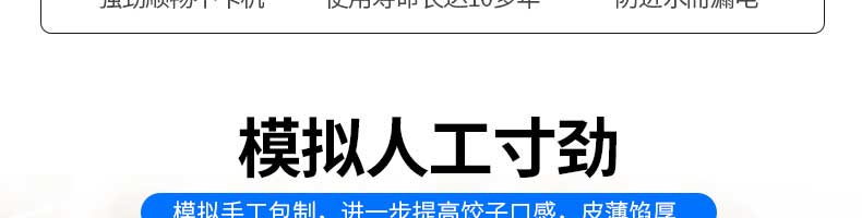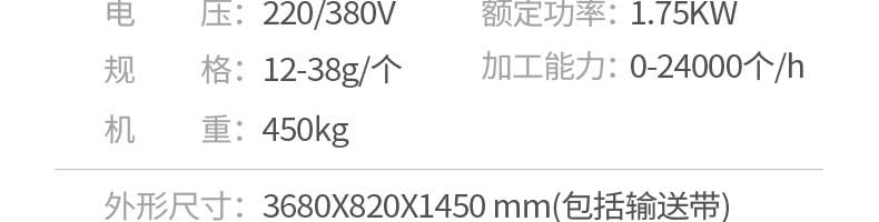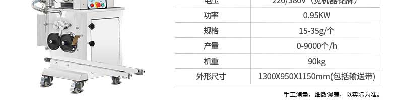 名稱JGB-360仿手工餃子機(jī) 電源220/380v 功率1.75kw 產(chǎn)量0-24000個/h 尺寸3680*820*1450mm 重量450kg 規(guī)格12-38g/個 其他