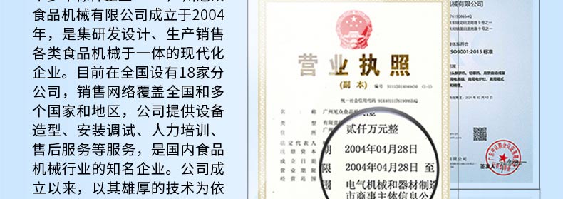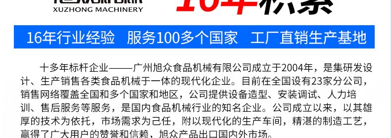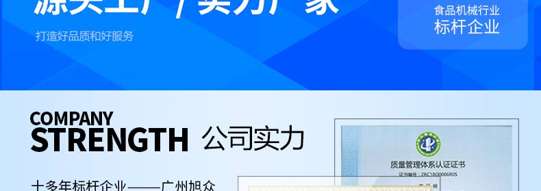 廣州旭眾食品機械有限公司是一家集科研開發(fā),生產(chǎn)設計,營銷服務為一體的現(xiàn)代化生產(chǎn)企業(yè)。現(xiàn)代化生產(chǎn)車間,精湛制造技術,所產(chǎn)機械歷經(jīng)市場重重考驗,不斷贏得海內(nèi)外客戶的贊譽。