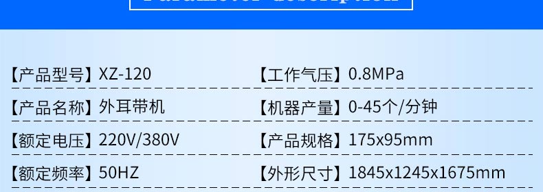 名稱全自動耳帶機 電源220v/380v 功率4.7kw 產(chǎn)量0-45個/分鐘 尺寸1845*1245*1675mm 重量詳情咨詢13113134411 微信13113134411蔣經(jīng)理 規(guī)格175*95mm 其他氣壓:0.8mpa