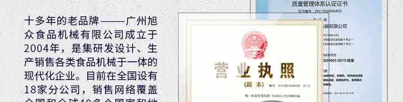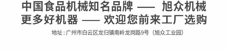 廣州旭眾食品機械有限公司是一家集科研開發(fā),生產(chǎn)設計,營銷服務為一體的現(xiàn)代化生產(chǎn)企業(yè)?,F(xiàn)代化生產(chǎn)車間,精湛制造技術(shù),所產(chǎn)機械歷經(jīng)市場重重考驗,不斷贏得海內(nèi)外客戶的贊譽。