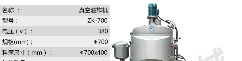 名稱zk-700雙室低溫真空油炸機(jī) 電源380V 功率11+3kw 產(chǎn)量15-60kg/次 尺寸1600*1600*2700mm 重量 規(guī)格料框數(shù)量1組;加熱方式:導(dǎo)熱油 其他